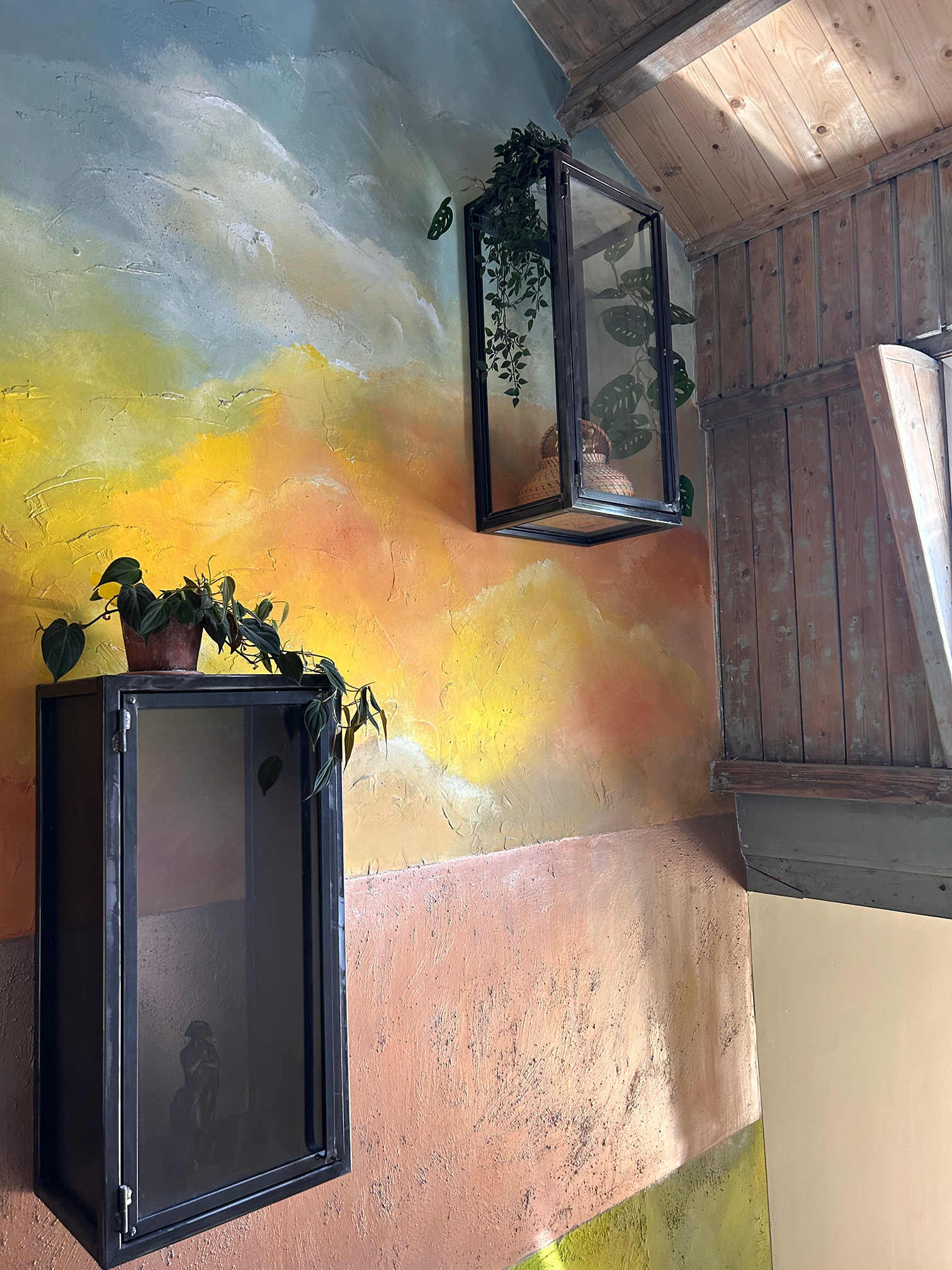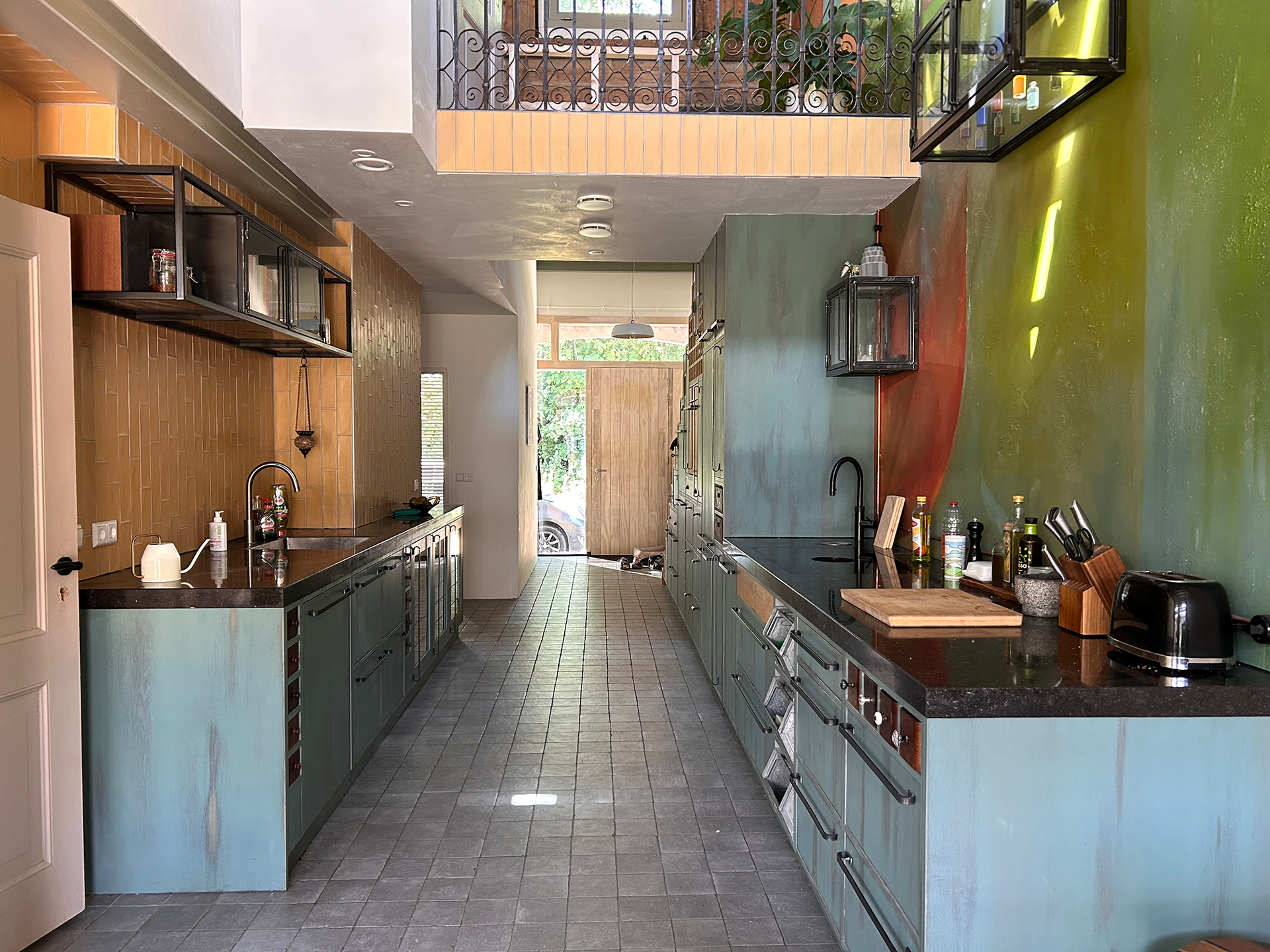 De keuken werd centraal in de woning geplaatst, met daarboven nog veel ongebruikte ruimte. In plaats van een traditionele trap hebben we een verrassende oplossing bedacht: een trap die begint op de keukenkastjes en zo toegang geeft tot een verhoogd niveau. Langs de hoge muur hebben we een kleurrijke muurschildering in reliëf gemaakt, die diepte en beweging aan de ruimte geeft. Stalen wandkastjes, in verschillende formaten, zijn speels verspreid opgehangen en gevuld met planten en persoonlijke objecten. Zo ontstond een woning die het industriële verleden omarmt, maar vol leven, kleur en eigenheid zit.