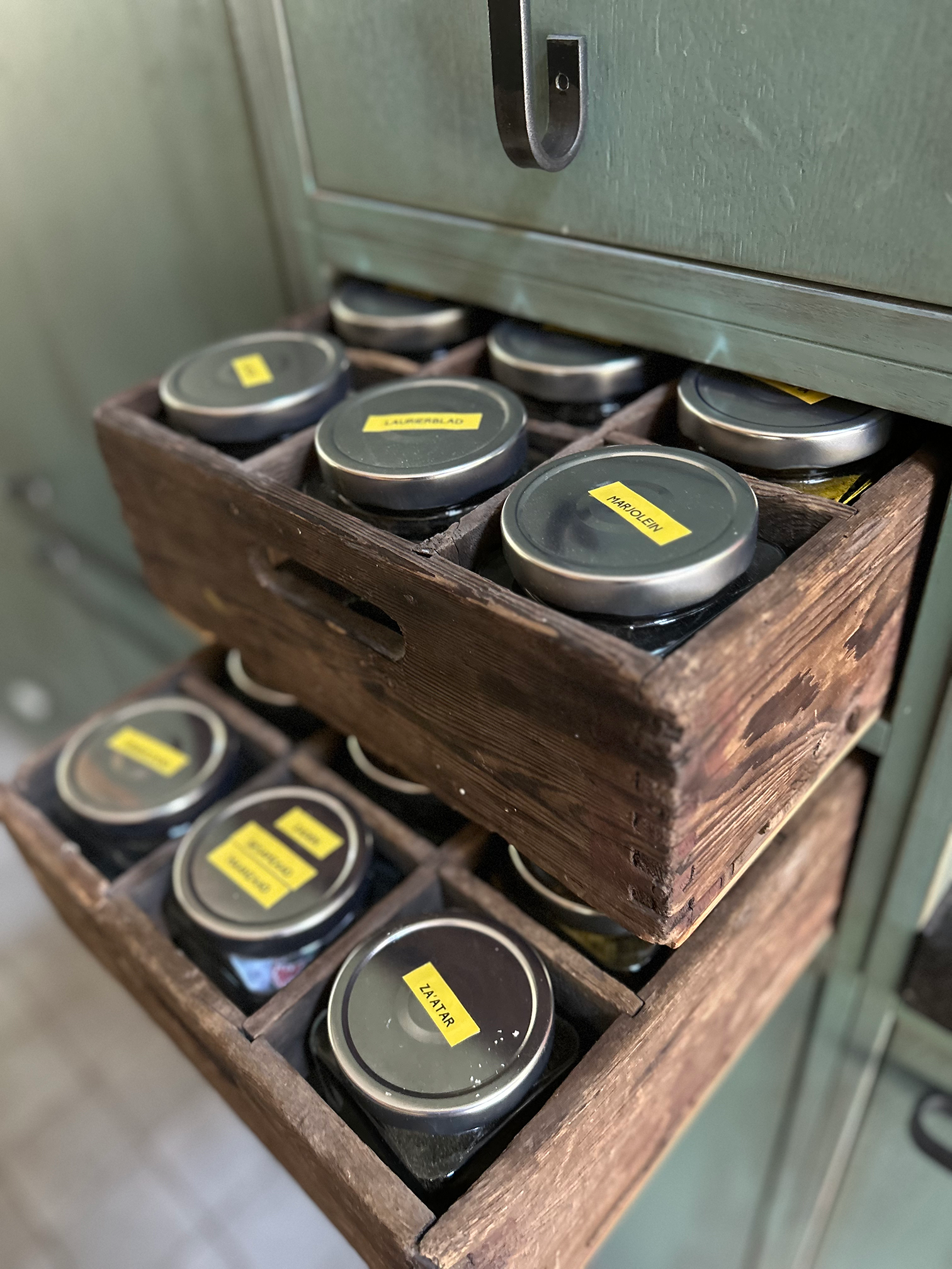 Foto hiernaast: oude naaimachine-laadjes werden besteklades.